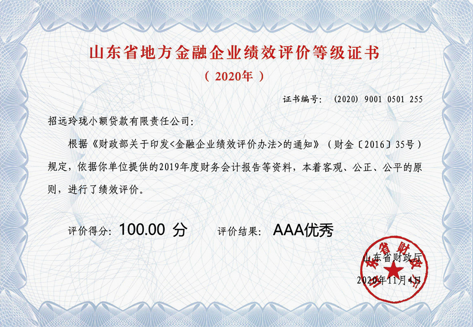 目前運營(yíng)的招遠玲瓏小額貸款有限責任公司成立于2014年,注冊資本1億元。公司依托股東資本優(yōu)勢、團隊優(yōu)勢和專(zhuān)業(yè)優(yōu)勢等綜合資源優(yōu)勢,堅持“安全、合法、效益”的放貸準則,充分發(fā)揮小額貸款“方便快捷、靈活高效”的信貸優(yōu)勢,著(zhù)力解決小微企業(yè)、個(gè)體工商戶(hù)和三農的融資困難問(wèn)題。在歷年山東省年度經(jīng)營(yíng)情況分類(lèi)評級工作中均被評為Ⅰ級,連續五年獲得山東省財政廳頒發(fā)的金融企業(yè)績(jì)效評價(jià)AAA優(yōu)秀證書(shū),位居山東省三百多家小額貸款公司前列。目前已為招遠市400多家小微企業(yè)和三農用戶(hù)提供了優(yōu)質(zhì)金融服務(wù)。